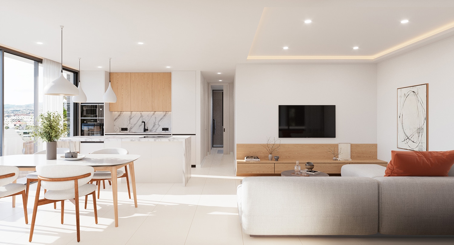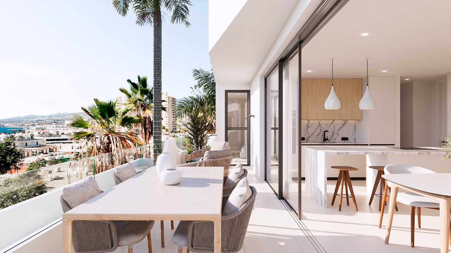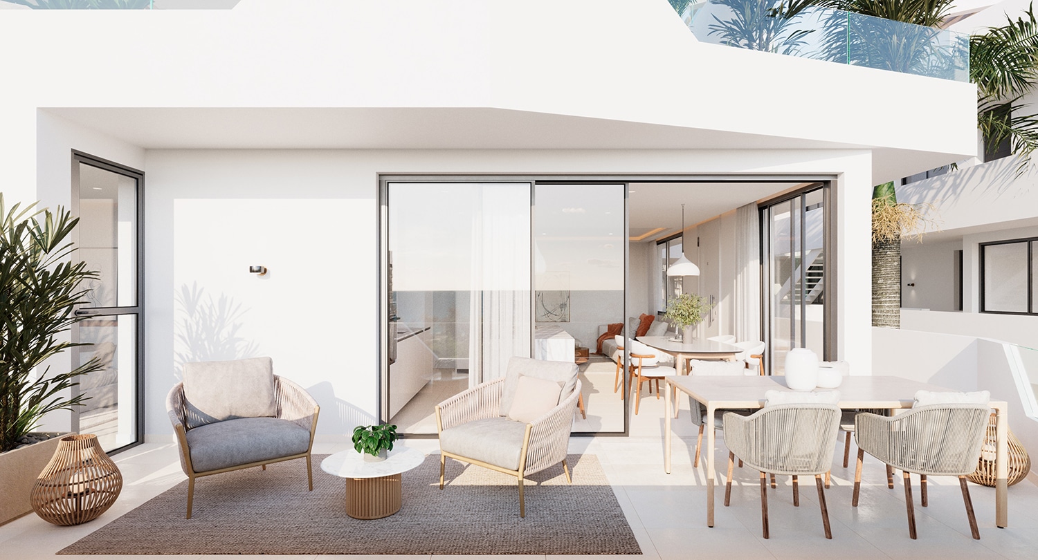 El interior fluye con naturalidad hacia el exterior gracias a sus grandes ventanales correderos, que conectan la zona de estar y cocina con una terraza perfecta para desayunos al sol, cenas con amigos o simplemente contemplar el atardecer. Cada rincón está diseñado con un cuidado exquisito, usando materiales nobles, tonos suaves y líneas limpias que definen un estilo elegante y actual.